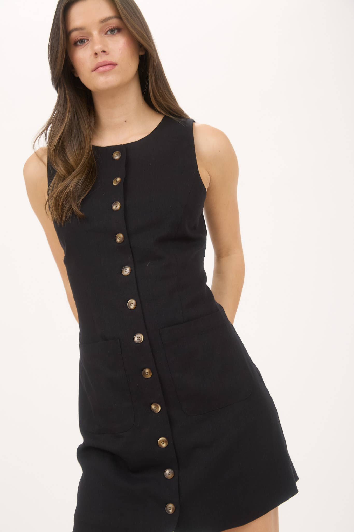 ROUND NECKLINE SLEEVELESS BUTTON DOWN BACK TIE STRAP DETAIL POCKETS LINEN BLEND SOLID LINED MIDI DRESS SHELL: 80% RAYON, 15% LINEN, 5% COTTON LINING: 100% POLYESTER